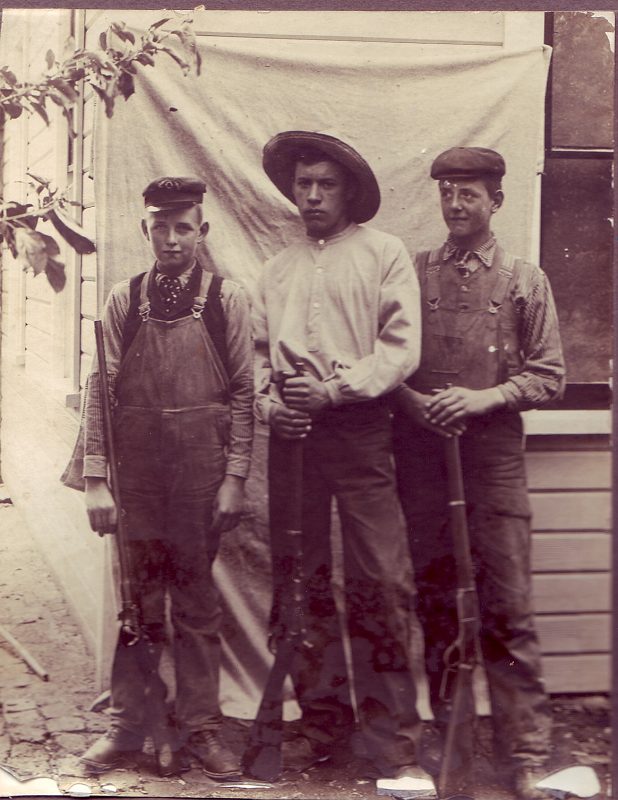 However this firearm has been in my family for a long time, and accordingly has a bit of sentimental value which surpasses the monetary kind. Below is a picture of my Grandfather (on left) as a boy holding it circa 1903. Discerning observers will also note the rifle in the hands of his brother (far right), is the 1876 SRC illustrated on my Winchester page. Pretty neat huh?
